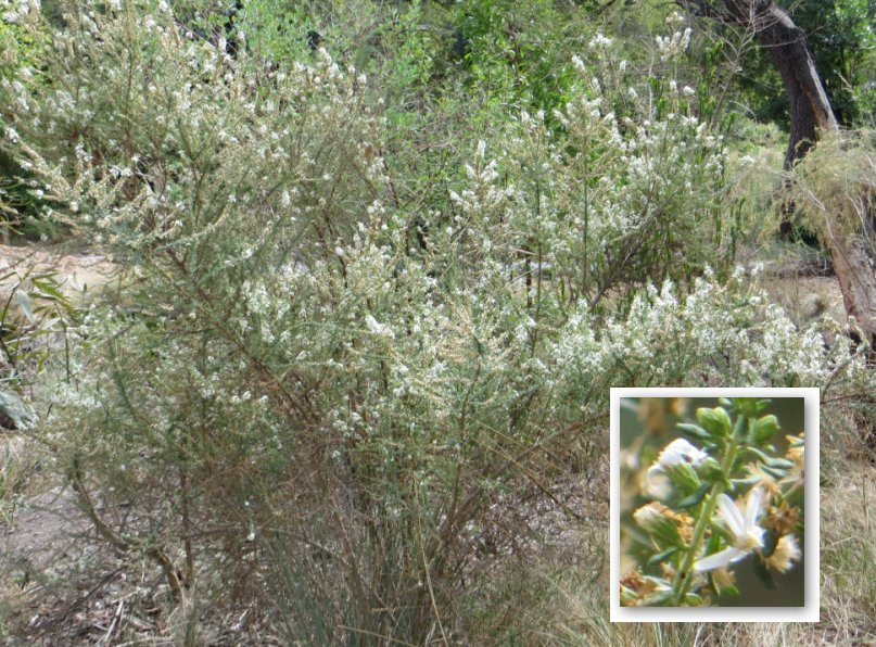 - This example is near the “Community Seat” (two seats at right angles) in Kalang Park on the south side of the creek not far from Main Street. Interestingly, there is another Cassinia there (should be “Cassinia Corner”) – Shiny Cassinia (Cassinia longifolia):