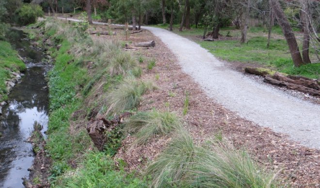 Landscaping – including four ephemeral wetland areas, new paths, removal of woody weeds, new post and rail fencing to link the area with nearby Blackburn Lake Sanctuary and hundreds of indigenous plants have combined with street treatments to transform this land. Seating is also planned.