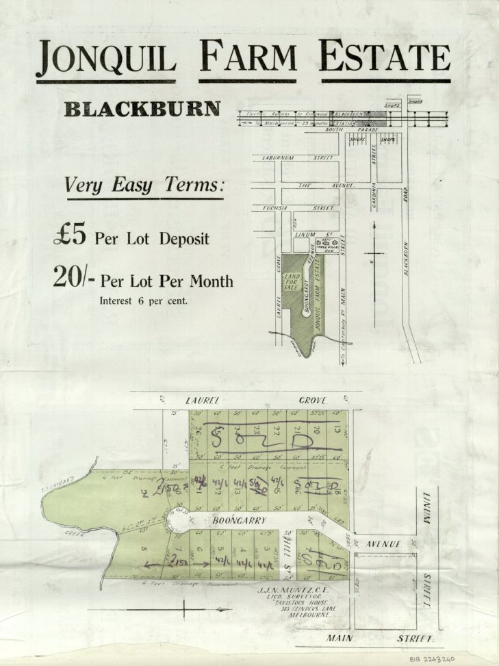 - The document below advertises the subdivision of a jonquil farm for housing in the Boongarry Avenue/Laurel Grove/Hill Street area on the northern side of the creek.