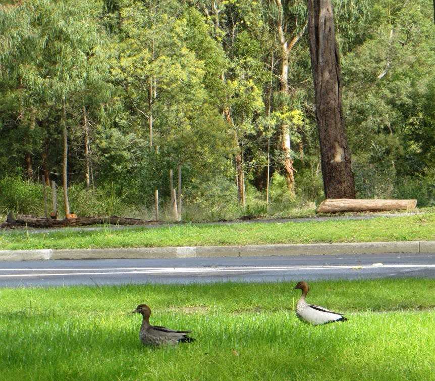 Our photo shows two Wood Ducks steppin’ out together (the male is keeping a respectful distance behind) just over Main Street in Furness Park – wondering when the park over the road will be planted out so they can cross over…