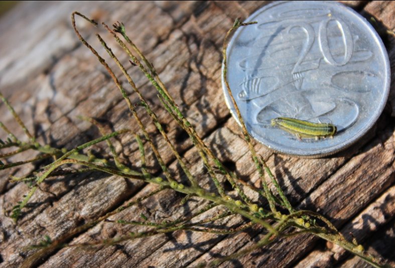 The defoliation of many Black Wattle (Acacia mearnsii) trees that has recently happened along the Creeklands has been caused by an outbreak of the larvae of the native Fire-blight Beetle (Acacicola orphana ). Well known in SE Australia including Tasmania, this insect occasionally builds up populations and eats most of the wattle leaflets, just leaving the mid-rib. Affected trees look brownish like they have been scorched by fire (see Photo 1) – thus the common name. Most trees recover but repeated attacks will weaken some trees, often leading to dieback and death.