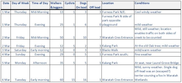 - We took a quick survey of park usage a few weeks ago. The results for part of the study below show counts for a one hour period at various locations and times of day in March. These show just how popular the park can be with walkers, joggers, cyclists and dog-walkers.