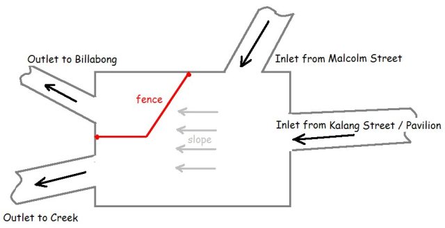 - The pit is about 2m deep. Basically, the way it works is that water has to get deep enough to flow over a small fence (currently about 150mm high) before it can flow into the Billabong. This means that the “first flows” from the street gutters, that are most likely to contain pollutants (such as oils from the roads), go directly to the creek as they used to. Once the water level in the pit gets high enough, water will flow over the fence to the Billabong as well. If the Billabong system eventually fills, it overflows to the creek.