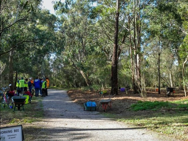 - Our first community working bee for 2018 was a great success. Given the weather conditions before and after, we were extremely lucky to have a beautiful sunny morning – which helped us get a lot done preparing for planting at our next working bee. Our photo shows the team having a “well earned” at about 10:30AM and the weeded and mulched area to the right. If you’re not able to work these days, please come along at that time on working bee days for a cuppa anyway!
