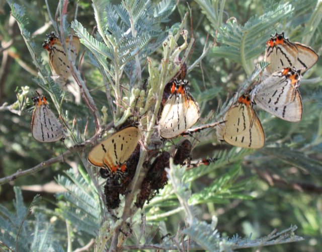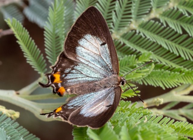 - Why are they called “Blue”? In the photo above, we can only see the pale yellow/buff underside of the emerging butterflies. As Ken’s photo below shows, the top side is quite different – dark black-grey-brown surrounding a sky blue centre. They also have a “tail” on the base of each hind wing with orange patches. While resting, the tails blow in the wind and look rather like antennae. This is believed to fool predators into attacking the more dispensable tails – rather than the head of the butterfly.