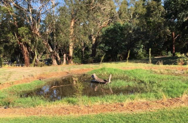 - As Megan’s photo shows, the little wetlands has been delineated with Melaleuca and other plants plus mulch and even has a log in the centre for birds to perch on.