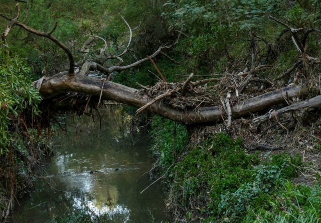 - On the evening of Friday 22nd, we received quite a surprising burst of rainfall and hailstones with nearly 30mm falling in less than an hour. The problem with such a fall is that much of it runs off into the storm-water system (which includes our creek) – rather than soaking in to the soil. Ruth’s photo of the flash flood debris in the fallen tree shows how high the water got in the creek.
