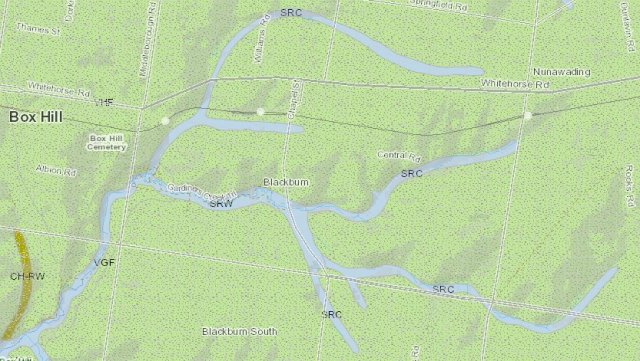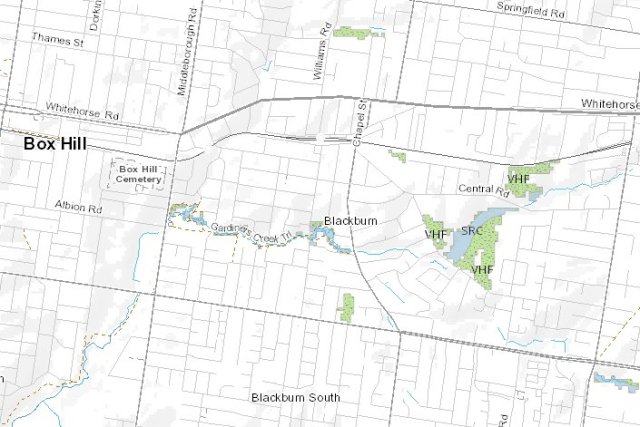 - The blue shaded areas (labelled SRC and SRW) trace the former stream lines of Gardiners Creek and several tributaries including the now mostly underground Blackburn Creek going north – which had one branch running along where the railway station is nowadays and the other going further north past the Blackburn Hotel site before arcing around towards Springvale Road. Interestingly, Blackburn Lake is not present – for a good reason, it was man-made in 1889 by the damming of Gardiners Creek.