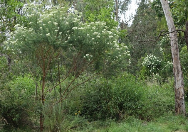 - It grows to between 1 and 3 metres high. The creamy-white flower heads are reminiscent of cauliflower heads – appearing in dense clusters from summer to autumn. Here is a close-up view of a “floret”: