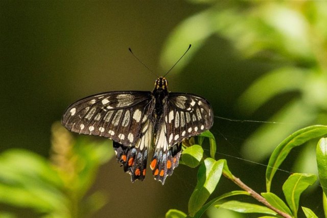 Dainty (or Dingy) Swallowtail perhaps flying too close to spider webs