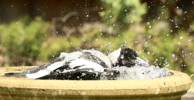 - Friend Hugh, who lives next door to Kalang Park (though not so close to the creek), has sent us some photos illustrating just how popular his birdbath is in this warmer weather: