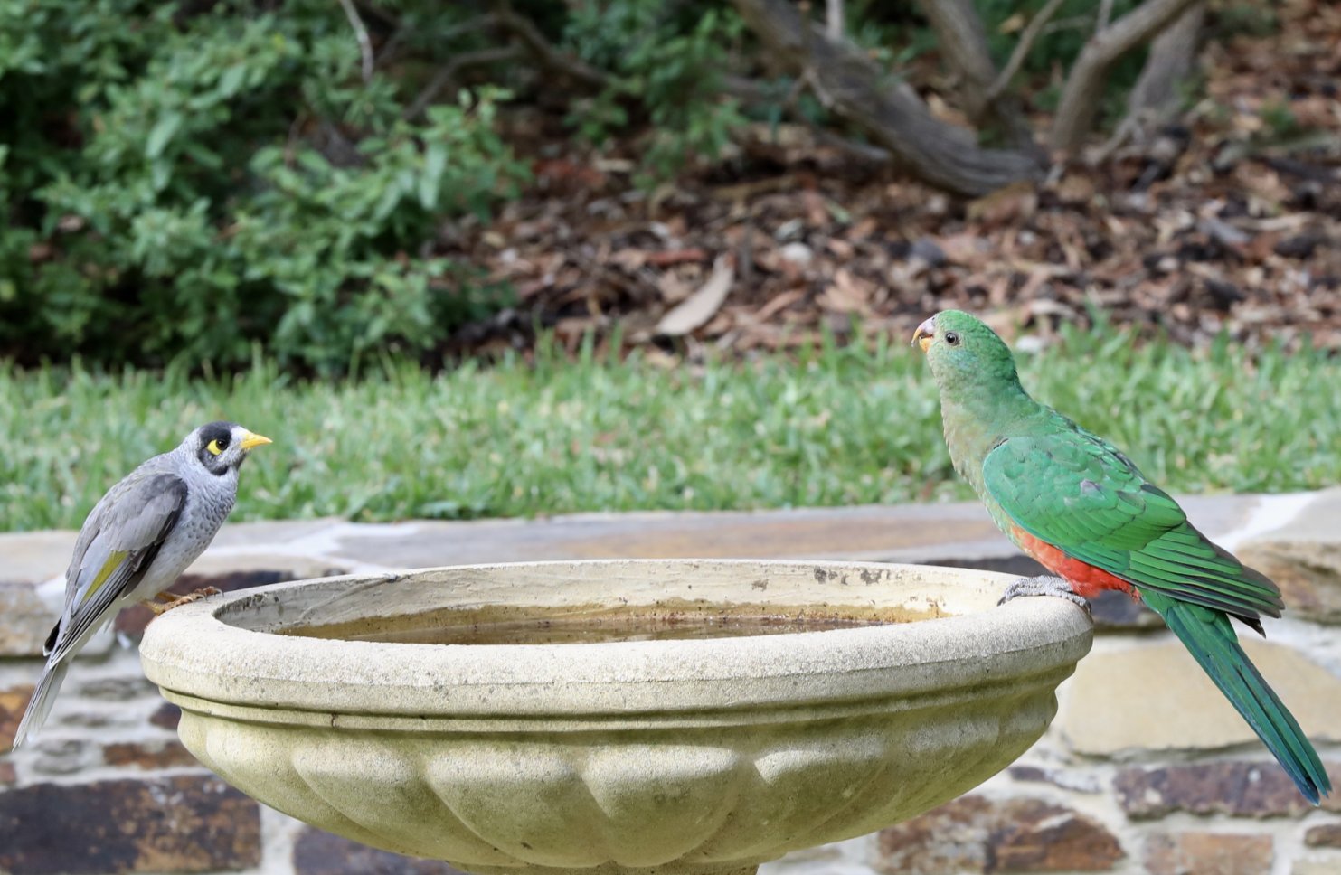Noisy Miner and King Parrot conducting water rights negotiations