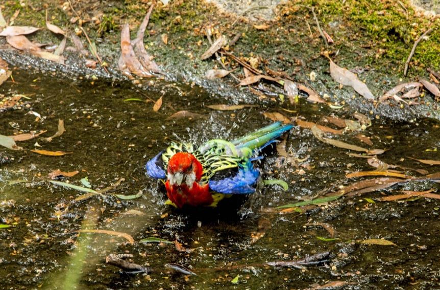 Bath time for an Eastern Rosella in the barrelled section of the creek