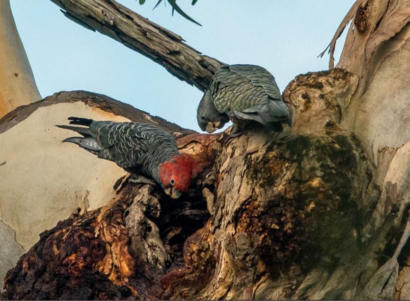 - The first “official” survey was conducted on 21/1 – this was very successful and resulted in a special viewing of a pair of Gang Gangs drinking from a very high tree hollow and then being attacked by a large whitish bird that was only glimpsed – possibly a Goshawk. The male Gang Gang has the bright red head…