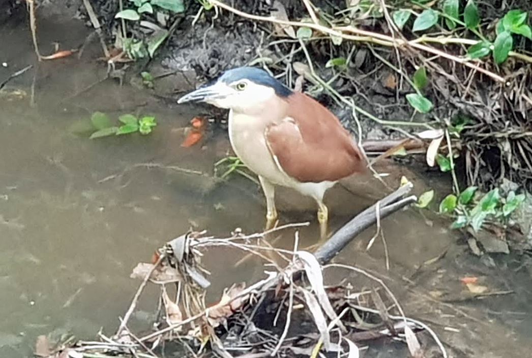 - A couple of Friends have queried what the bird above is. This guy is probably not in the category of a refugee from the fire-zones – but is actually a regular visitor around January. It is a Nankeen Night Heron – a fairly chunky heron with rich cinnamon brown upperparts (upper wings and back), white-buff underparts, a blue-black crown and yellow legs/feet. It has a large head, a short neck and shortish legs giving it a stooped or hunch-backed appearance. Friend Paul says “I’ve lived nearby for 10 years and don’t think I’ve seen one before. A pretty bird, looked out of place standing on the edge of the creek in shallows. I’ll keep an eye open for them now.”