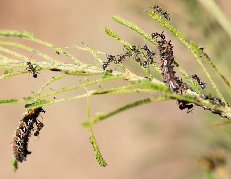These glorious butterflies have a vital association with ants. The female butterflies lay their eggs on wattle trees – usually Silver Wattle (Acacia dealbata) – but only trees that have the scent of the Tyrant Ant. When the caterpillars hatch, they call the ant by clicking hard parts of their bodies. The ants come and protect them and as a reward, the caterpillars secrete a sugary substance that the ants feed on. The ants stay all the way till the butterflies hatch and even the pupa can communicate with the ants.