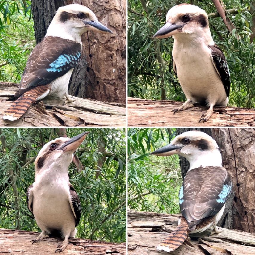 During a picnic in the park under the oak tree yesterday [7/11], I heard a kerfuffle along the creek. Found at least four Kookaburras chatting together… The collage [of photos] reminded me of the Brady bunch intro, all looking up and down, and have had the lead tune as an ear-worm all morning…‘Here’s a story, of a lovely lady’…etc etc!!