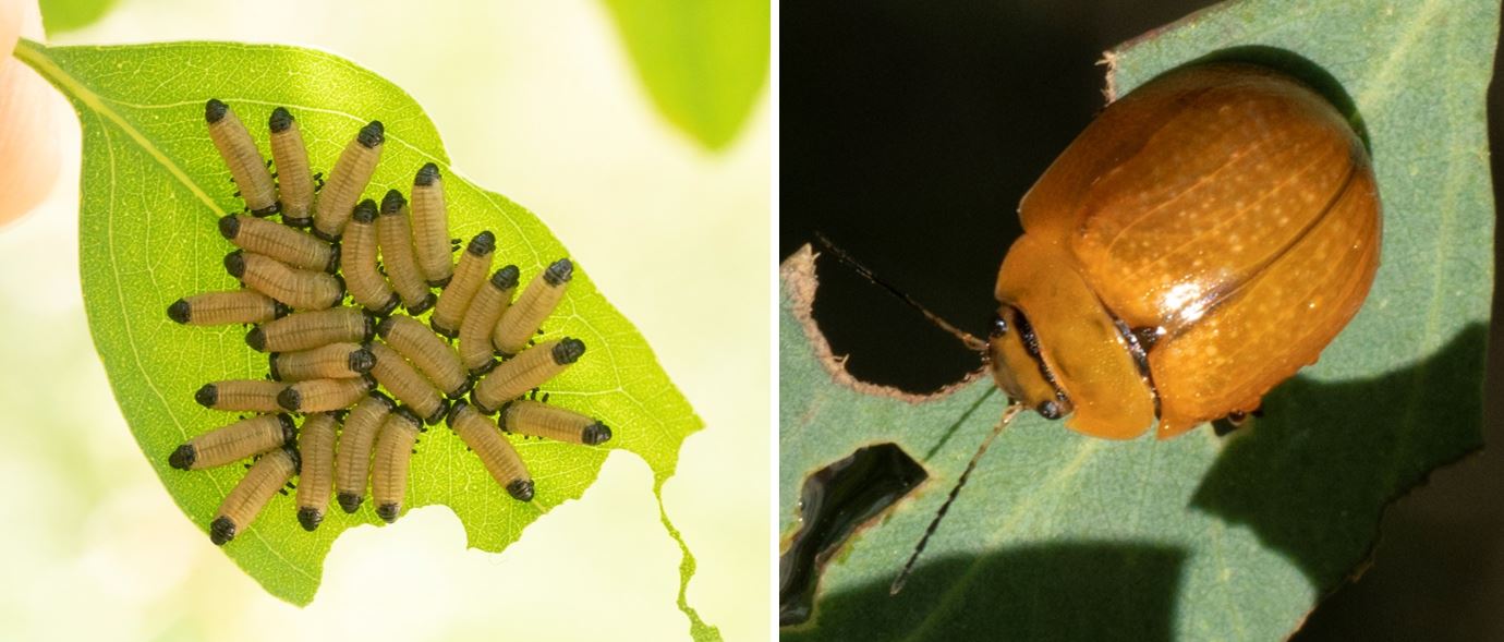 You can see these on small gum trees now. When they have grown a little more, they will change into a pupa – probably staying in the leaf litter under the tree. Then they hatch into these beautiful beetles which are the size of your little fingernail. They are in the family Chrysomelidae.
