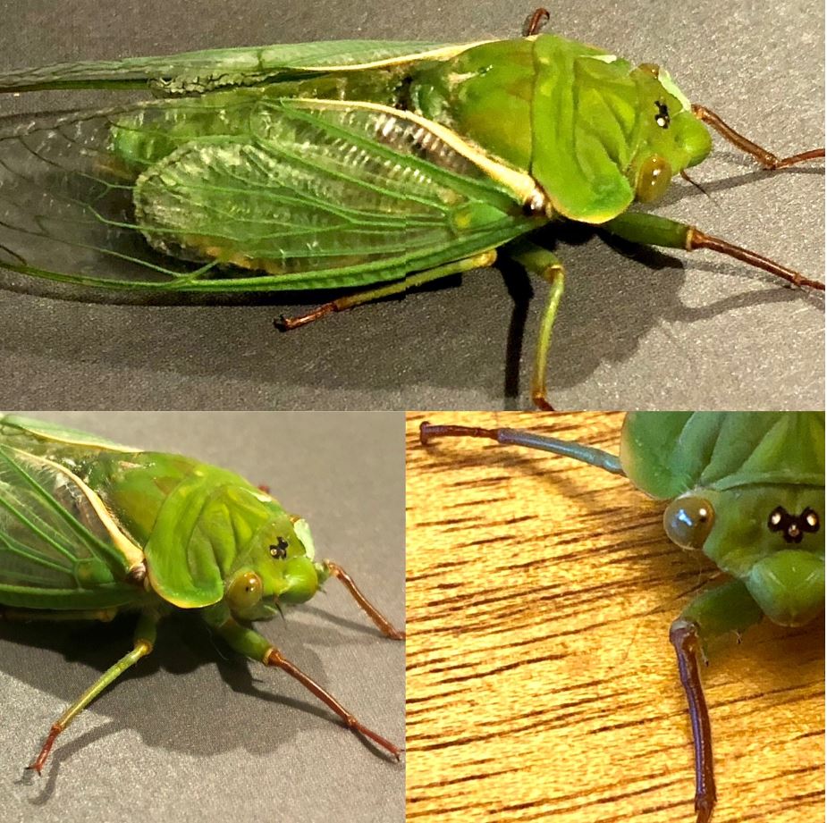 Wendy’s photo shows the shell of the Greengrocer Cicada (Cyclochila australasiae) as it has hatched from a nymph into the large beautiful green Cicada on its right.