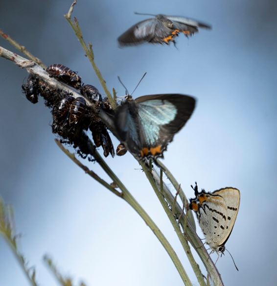 These glorious butterflies have a vital association with ants. The female butterflies lay their eggs on wattle trees – usually Silver Wattle (Acacia dealbata) – but only trees that have the scent of the Tyrant Ant. When the caterpillars hatch, they call the ant by clicking hard parts of their bodies. The ants come and protect them and as a reward, the caterpillars secrete a sugary substance that the ants feed on. The ants stay all the way till the butterflies hatch and even the pupa can communicate with the ants.