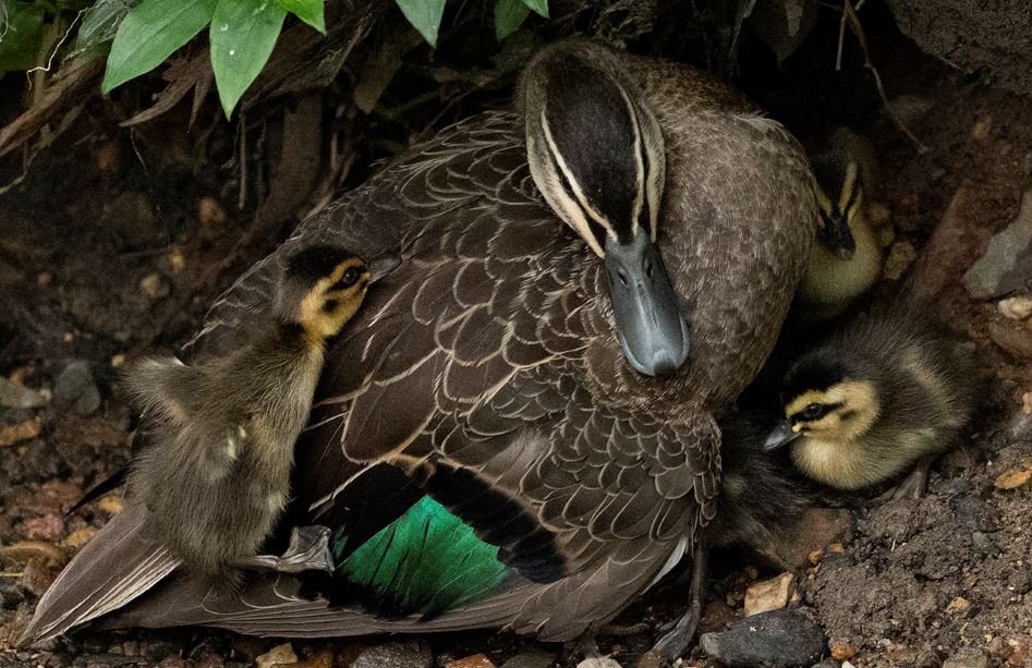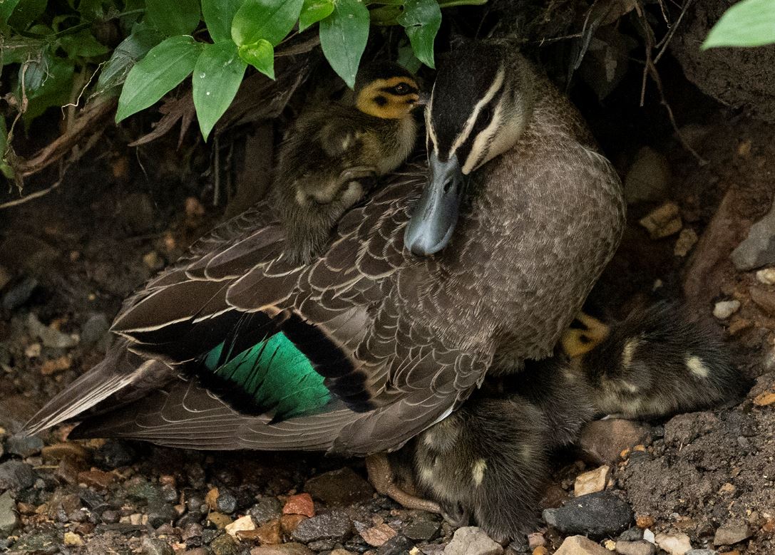 Several members of the public also noticed the poor chick and reported its plight to Council (Council reps had also noticed it). They also reported that the chick appeared to have an eye injury at that time. The Council representative agreed with the initial carer’s assessment – in fact, he couldn’t actually see the chick as its Dad was sitting on it the whole half hour or so of his visit – there being light drizzle/ rain most of that time.