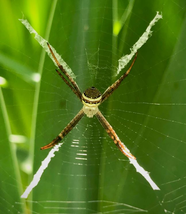 The spider has a habit of keeping pairs of its legs together which match part of the structure of their webs. They tend to hang upside down on their webs awaiting a misfortunate insect such as a moth or mosquito. For those who know their electronic components, Lisa thinks the body of the spider looks like a 33&1/3 Ω resistor.