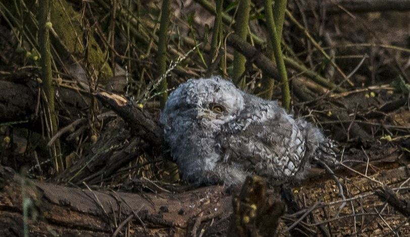 A chick was found on the ground late afternoon of November 3rd after a fall from its family’s nest – probably during the high north-easterly wind gusts experienced that day. An experienced Tawny Frogmouth wildlife carer was consulted and she believed “monitoring from a distance” was the preferred management option at that time. The chick’s two parents were nearby – being very protective and attentive.