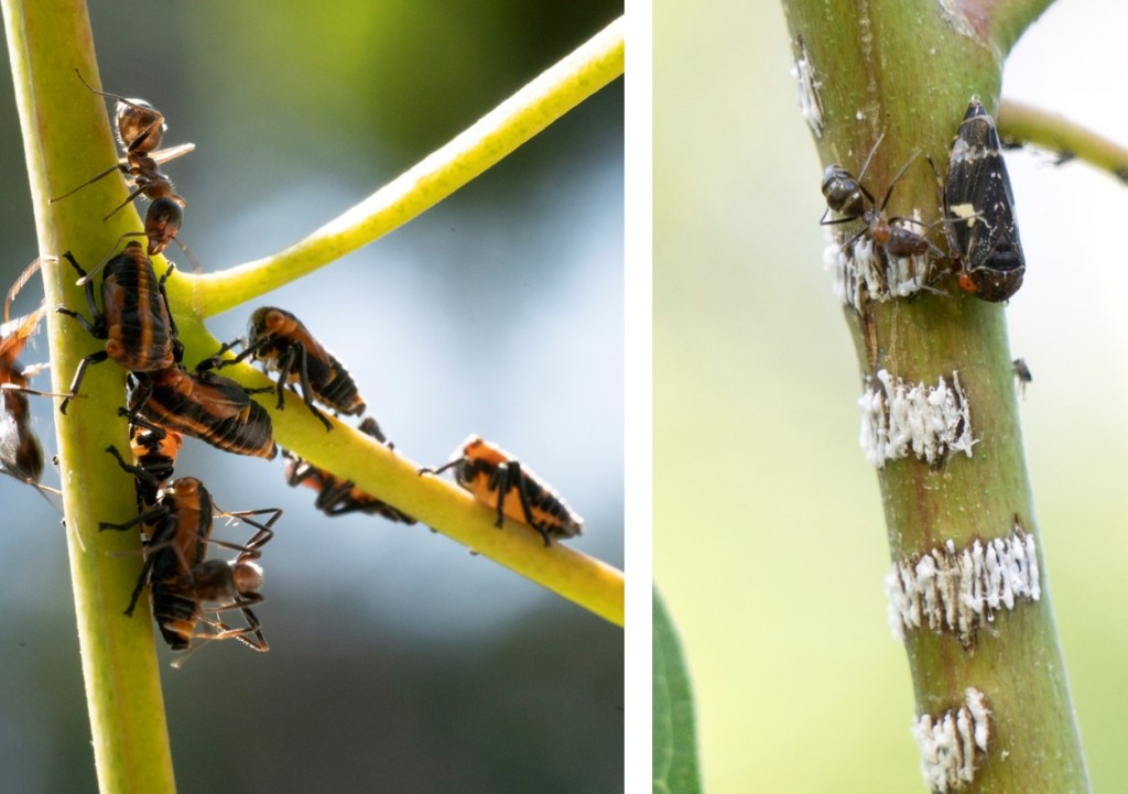 Leaf Hoppers – both juvenile and adult – excrete sugar as a by-product of sucking sap. Like the symbiotic relationship we saw between the Imperial Blue Butterflies and Tyrant Ants in last edition, ants tend the hoppers and feed on the sugar. The amount of sugar in sap is much higher than the amount of amino acids they need for food, so they excrete the excess.