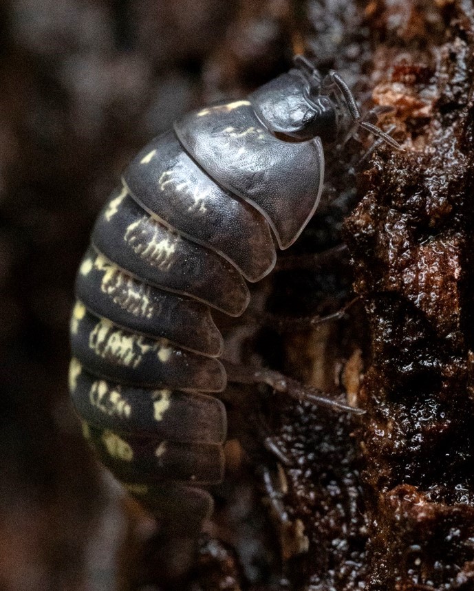 This is an imported large slater (Armadillidium vulgare) that can roll up into a ball for protection. It was seen on the bark of a tree on the wet morning after rain.