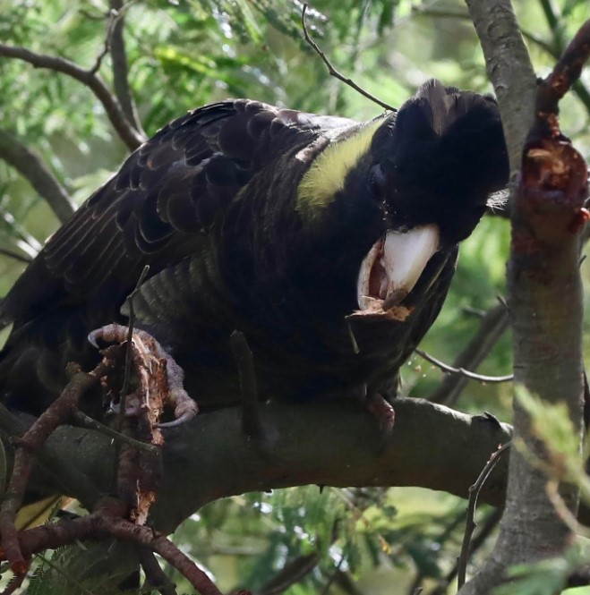 One of our favourite visitors, the Yellow-tailed Black-cockatoo, has been sighted again the park over the lest few weeks. Hugh sent us these photos showing one tucking into grubs they find under tree bark.