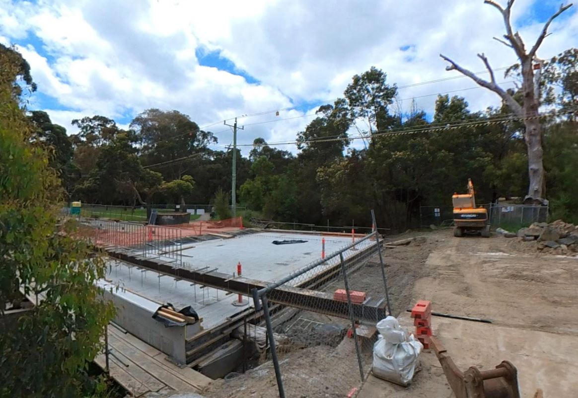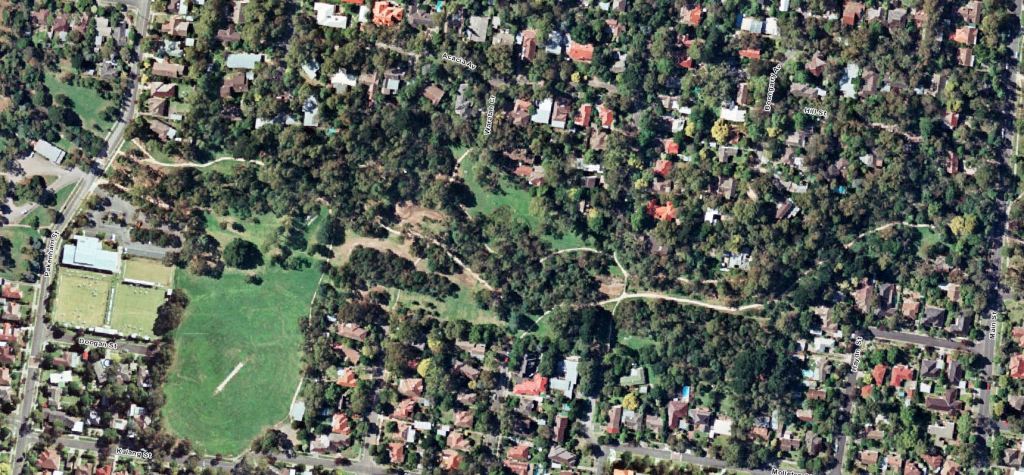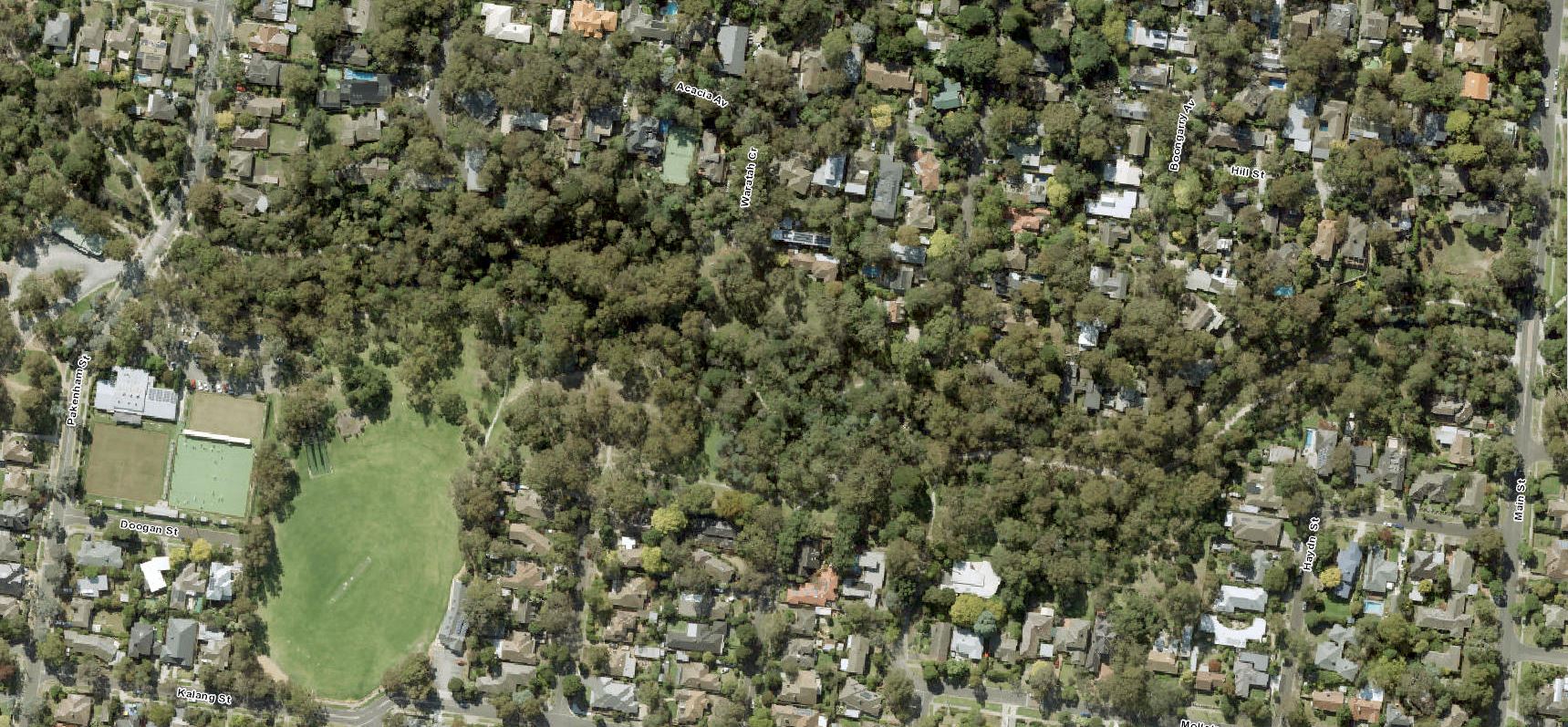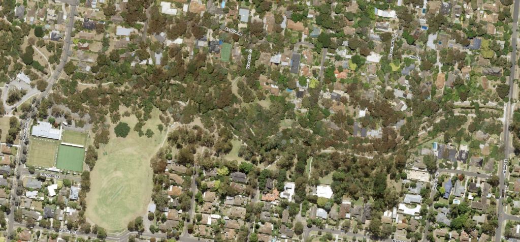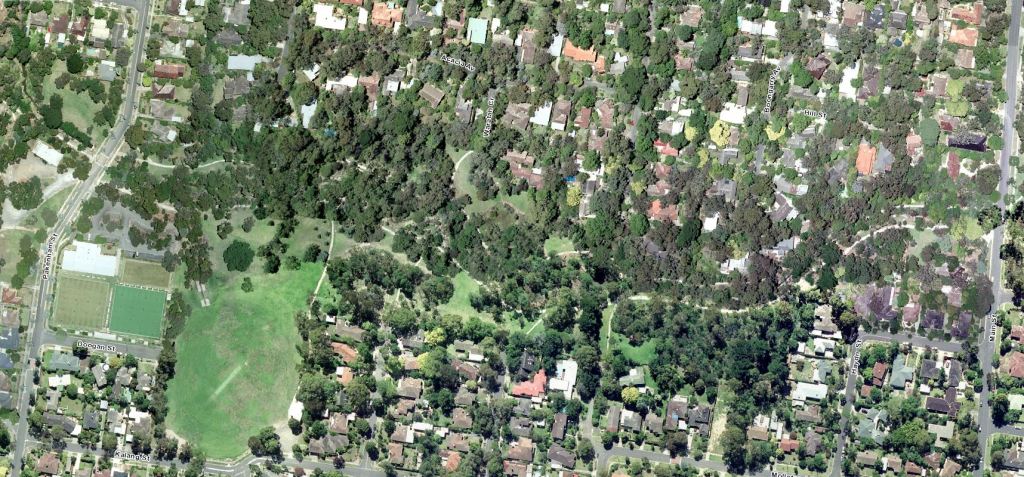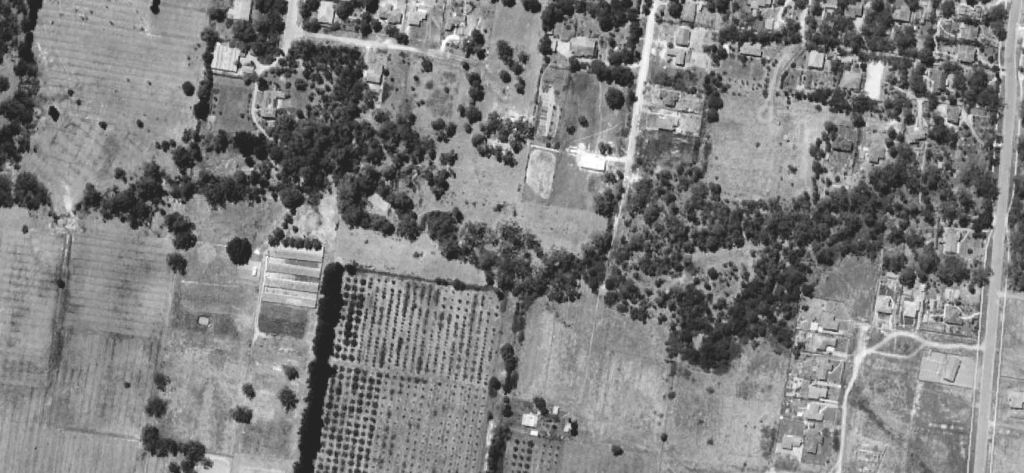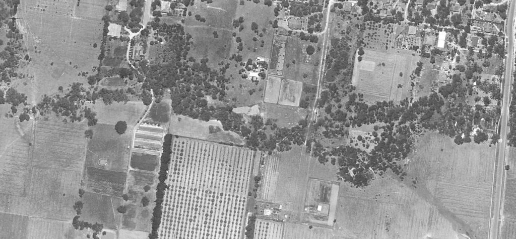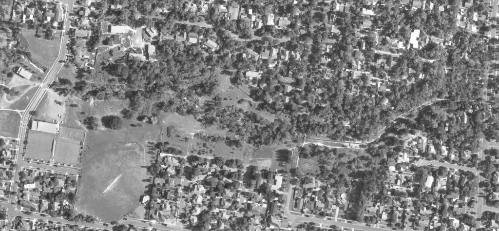 - By 1963, the last of the agricultural land had been subdivided for housing and there were comparatively few vacant blocks left. The Dwyer’s poultry sheds and surrounding orchards had been cleared on the western side of the park. Malcolm Street and Sheehans Road have emerged from farm driveways. To the east, the creek had been “barrelled” – seeming to take its concrete self through the middle of the two natural streams. The Laurel Grove bridge is clearly visible at the western end of the concrete barrel. Pakenham Street was fully made including its bridge over the creek. You can see hints of the first walking tracks through the park – especially off Pakenham Street north of the creek heading east and then, possibly, south across the creek. We know there were no tracks through the steeper bushy area further east. The tree canopy cover along the creek and to the north had noticeably improved. The Blackburn and District Tree Preservation Society had formed in 1959 to “save our national heritage of native trees and plants”.