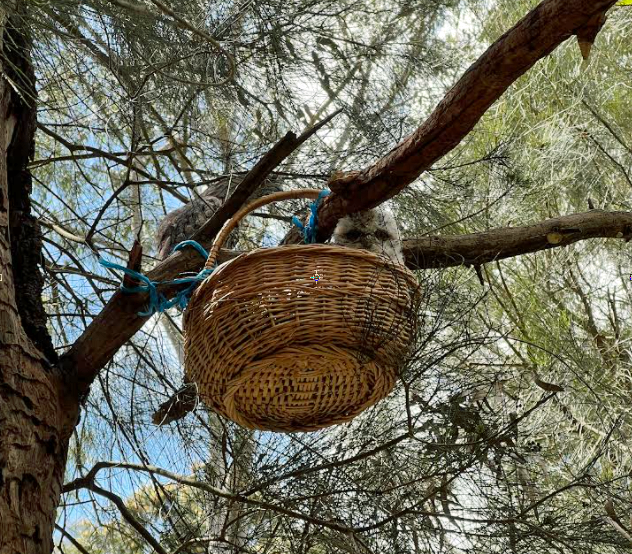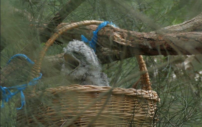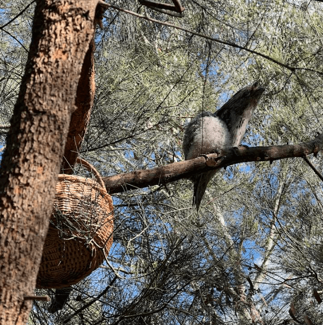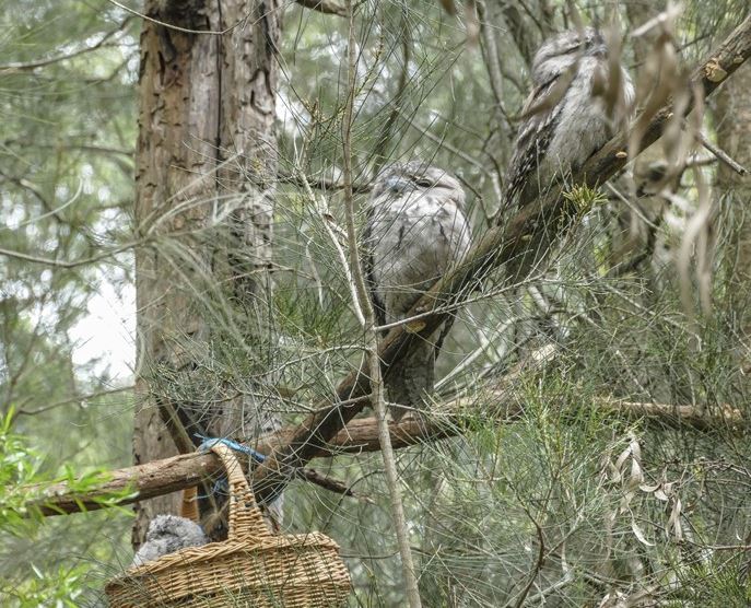 Local resident Melanie called Wildlife Victoria who suggested attaching a makeshift nest in this tree and placing the chick inside it, with the hope that the parents would resume their care. Melanie and husband Tony set to work and installed a wicker basket about 2m above ground into which they deposited the chick – despite its noisy and wing flapping protestations. The manoeuvre proved successful, the parents were observed near the chick soon after, at times defending it against inquisitive Pied Currawongs. These were nesting nearby and will readily eat the young of other birds, so even though the young Tawny Frogmouth was off the ground, it was far from safe.