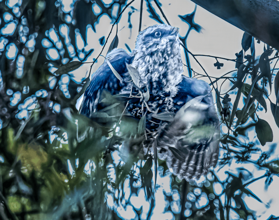 STOP PRESS: Tawny Frogmouth family feeding at dusk – this is the rescued chick-in-a-basket family as at the last day of November – clearly the young one is thriving and keeping its very attentive parents quite busy: