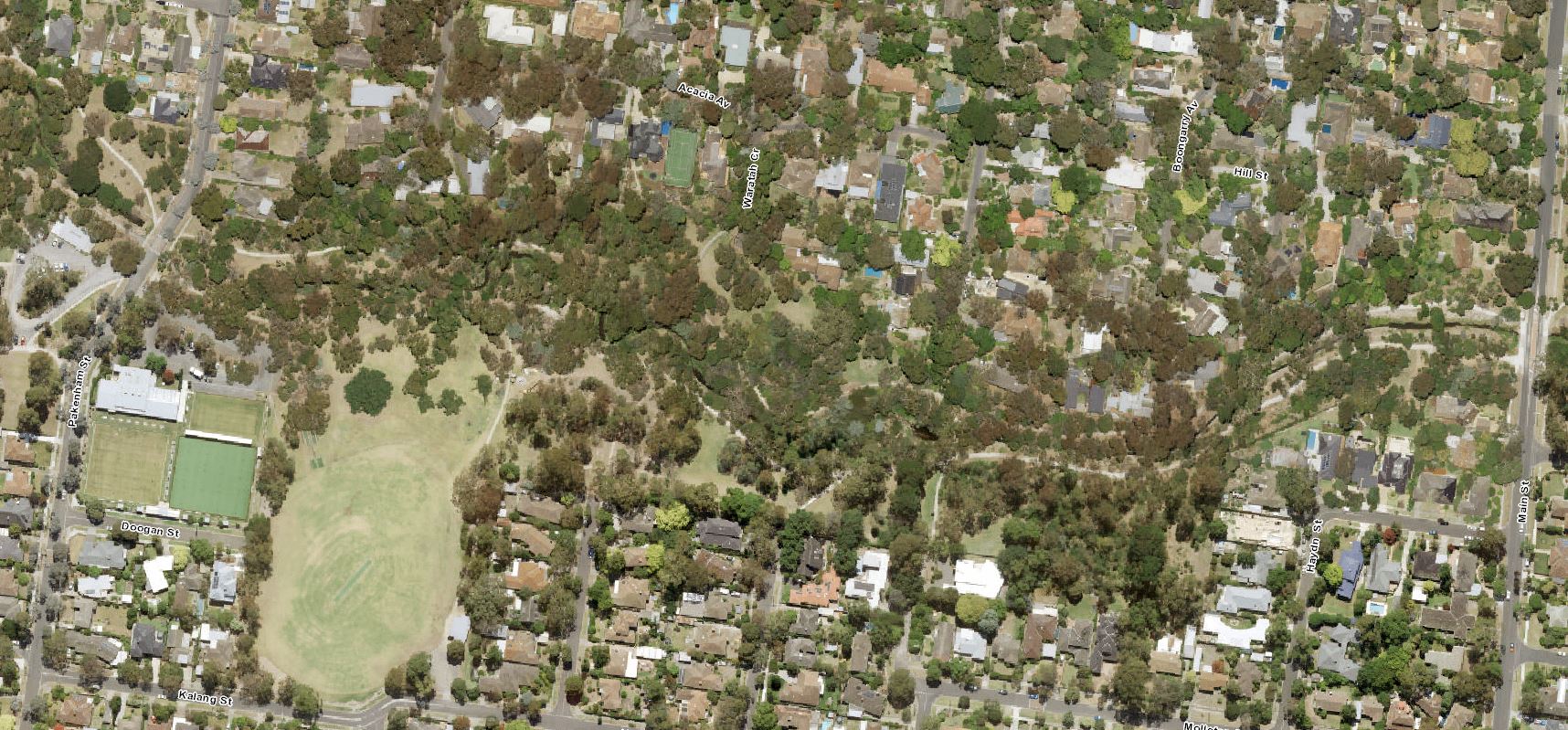 - The 2015 photograph seems to show the enduring effects of the Millennium Drought (1996 – 2010) with significant loss of canopy density. Fortunately, extensive rehabilitation work had been conducted by Melbourne Water along the creek between Blackburn Road and Pakenham Street in 2006-2007. This work reduced the threat of erosion and consequent loss of mature eucalypts and other large indigenous trees on the creek banks. In 2013, the path in the northeast corner of Kalang Park was realigned away from the creek along with significant rehabilitation works there.