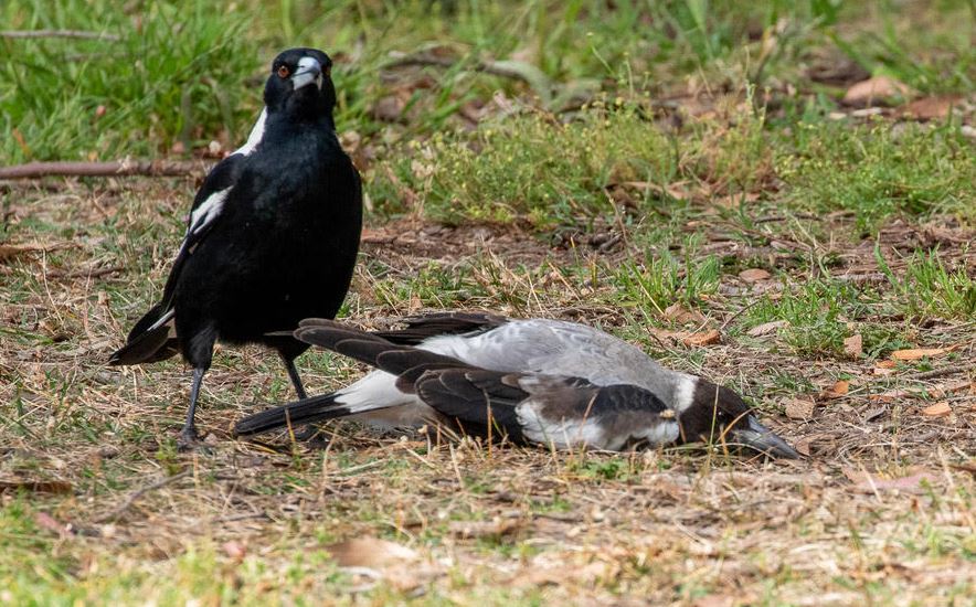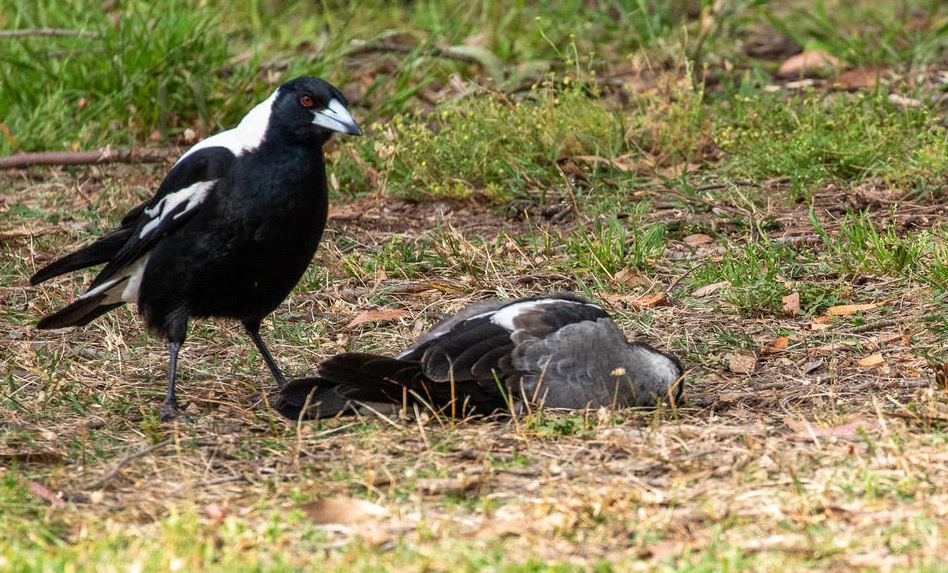 An odd behaviour – a juvenile magpie pretending to be dead for parental attention ?