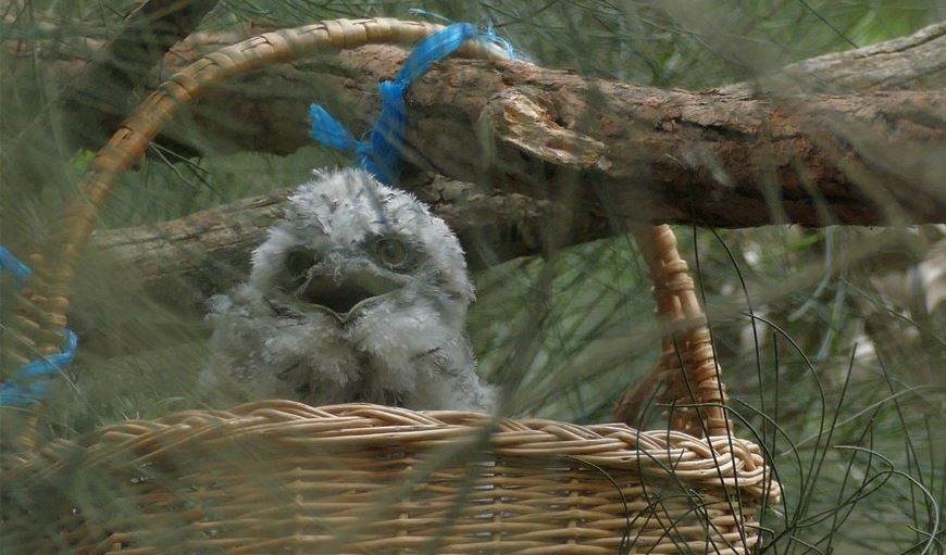 In the following days, the pair of adults kept taking very good care of their young, staying close and watchful, feeding it and keeping it warm. The chick moved from the basket onto a branch where it remained, usually cuddled up to one parent while the second parent remained nearby.