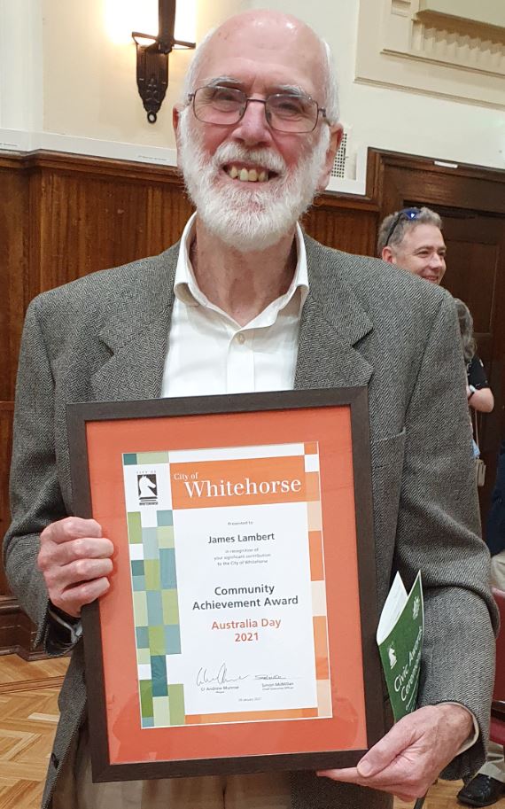 In January 2021, one of our Committee members, Jim Lambert, was awarded a Whitehorse Community Achievement Award on Australia Day – in recognition of the enormous contribution he has made over many decades to the Blackburn environment generally and to the Blackburn Creeklands in particular. Jim and his colleagues’ seminal work on planning controls that protect our most sensitive areas against over-development and from loss of tree cover are significantly responsible for our treasured Blackburn environment being what it is today.