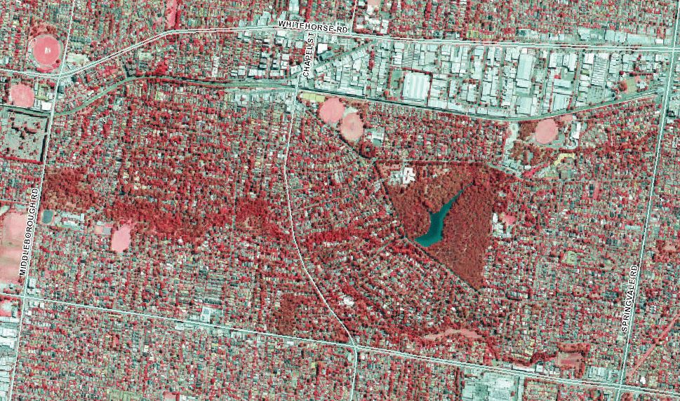 At a more general level, our photo illustrates why Blackburn is such a great place to live. Gardiners Creek (Kooyongkoot) is the focus of the wavy red band extending to the west from the deep blue/green Blackburn Lake. The Blackburn Creeklands extends from Blackburn Road (the bent road) to Middleborough Road on the left. The major tributary from the Masons Road Reserve is also obvious just north of Canterbury Road.