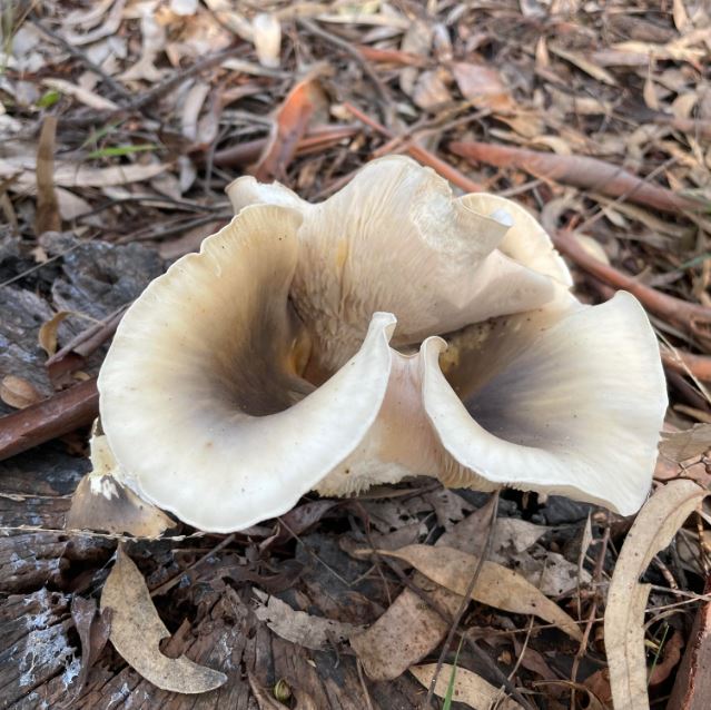 These funnel-shaped fungi start out looking like orange-ish toadstools and eventually flatten out with age. They are found on both living and dead wood (especially Eucalypts) – often in overlapping clusters. Once mature, their colour can vary from white or cream with blue-black centres, yellow tinges and tones of purple or pink. Their soft green luminescence is due to a reaction between enzymes inside the fungus and oxygen.