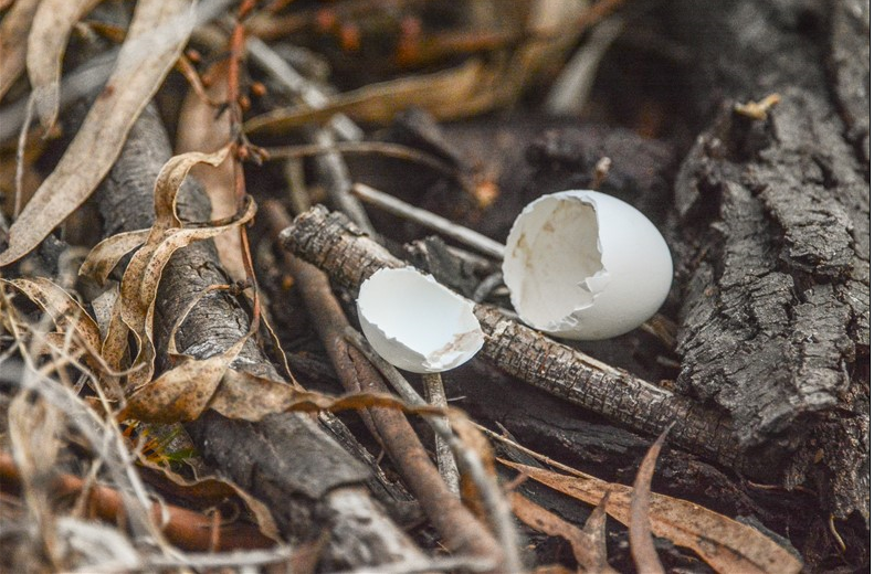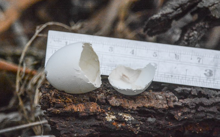 Other clues might be the shell colour, shape, the time of hatching and what birds were in the vicinity. It seems like the egg would have been a little over 3cm long – so, much smaller than a chook’s egg. Incidentally, we occasionally find the latter in the park – Currawongs or Little Ravens steal the eggs from nearby chook-houses and stash them for a feed later on.
