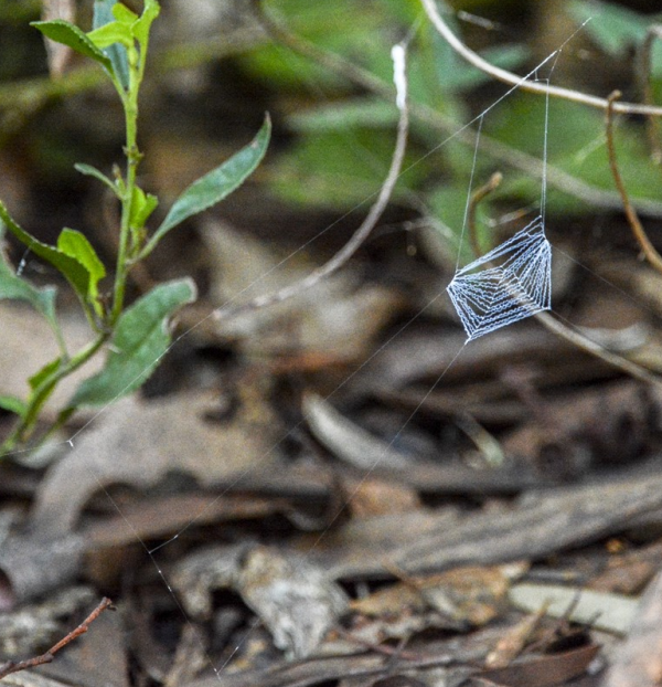 One of our weeders disturbed a female net casting spider Deinopis sp. The spider hunts at night and hides during the day. Here is an example of a net in place – taken recently at Blackburn Lake Sanctuary: