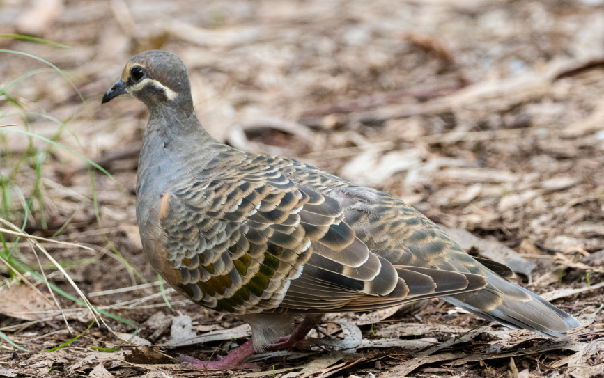 There are many indigenous species of Columbiformes (Pigeons and Doves). We see 2 of nearly 30 in our park: the Common Bronzewing and the Crested Pigeon – the latter seen in our Bird Survey photos. This bird is not one of them: