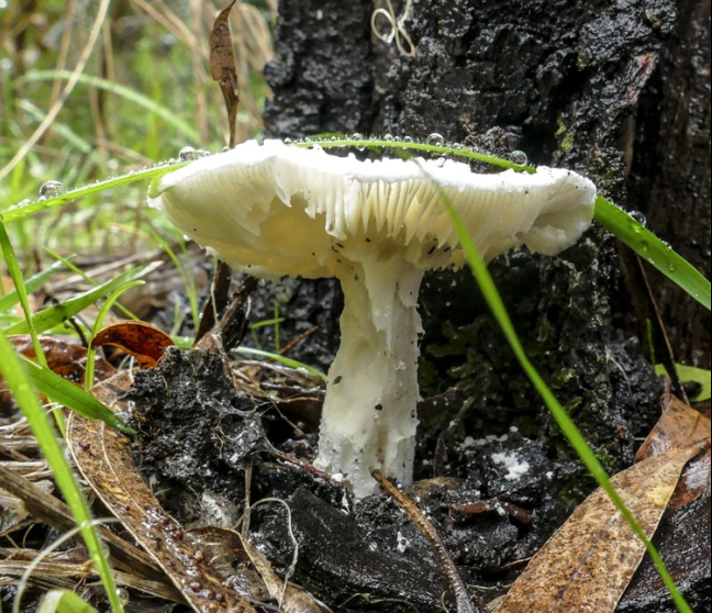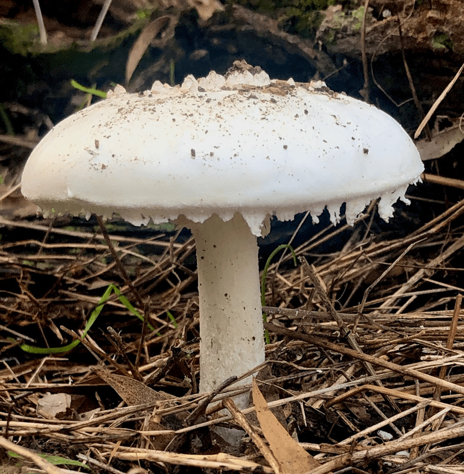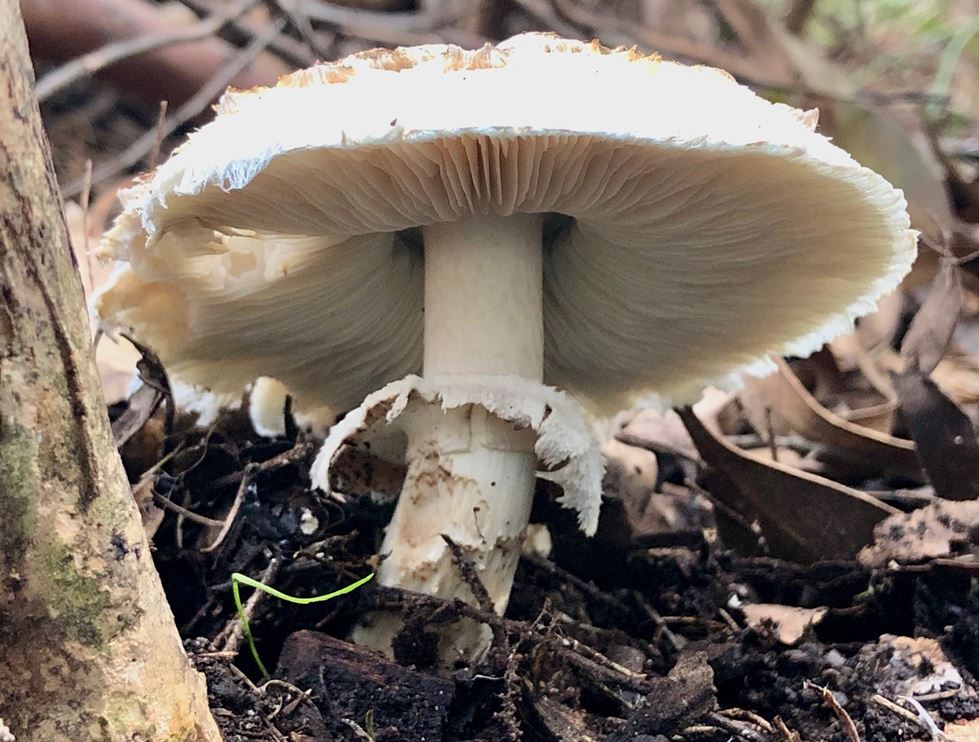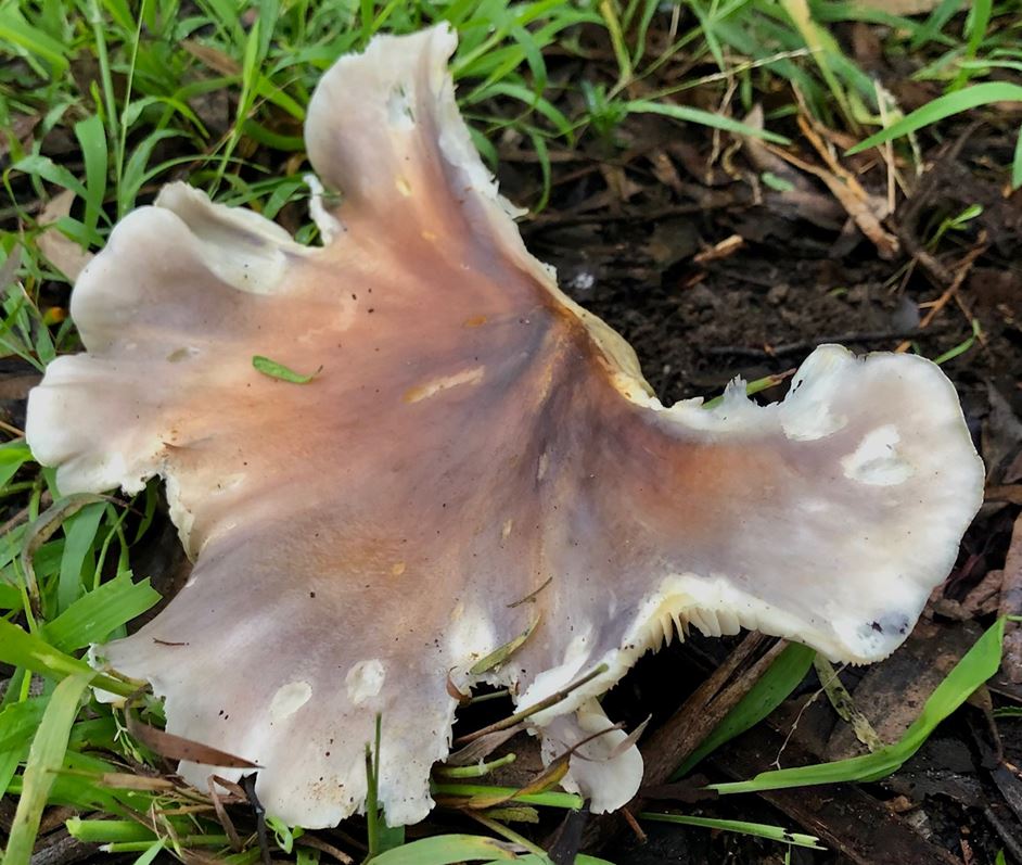 Lisa thinks her find in the park is evocative of a cappuccino’s froth brimming over the top of a coffee cup with chocolate powder sprinkled on top. She believes the species is Amanita farinacea. Farina means flour – and the common name of that species is Australian Flour Lepidella. It’s interesting how older generations saw “flour” and the newer ones see “cappuccino” !