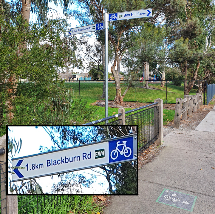 As can be seen, EW4 crosses to the south of the park and also skirts Blackburn Lake Sanctuary on its way from Box Hill to points further east. So our problem sign should be pointing to Janet Street, not into the park.