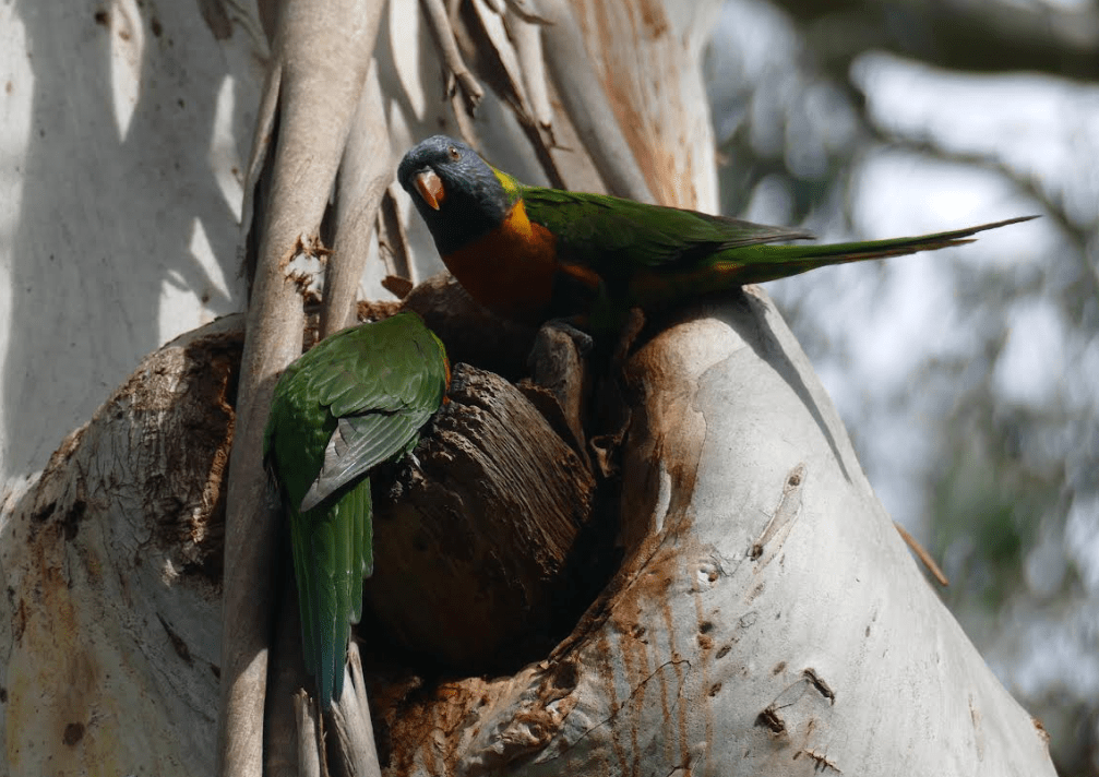 Birds often drink water that accumulates in tree hollows from good rains – such as we experienced during most of June. This pair of Lorikeets are either drinking or evaluating the hollow as a nest hole: