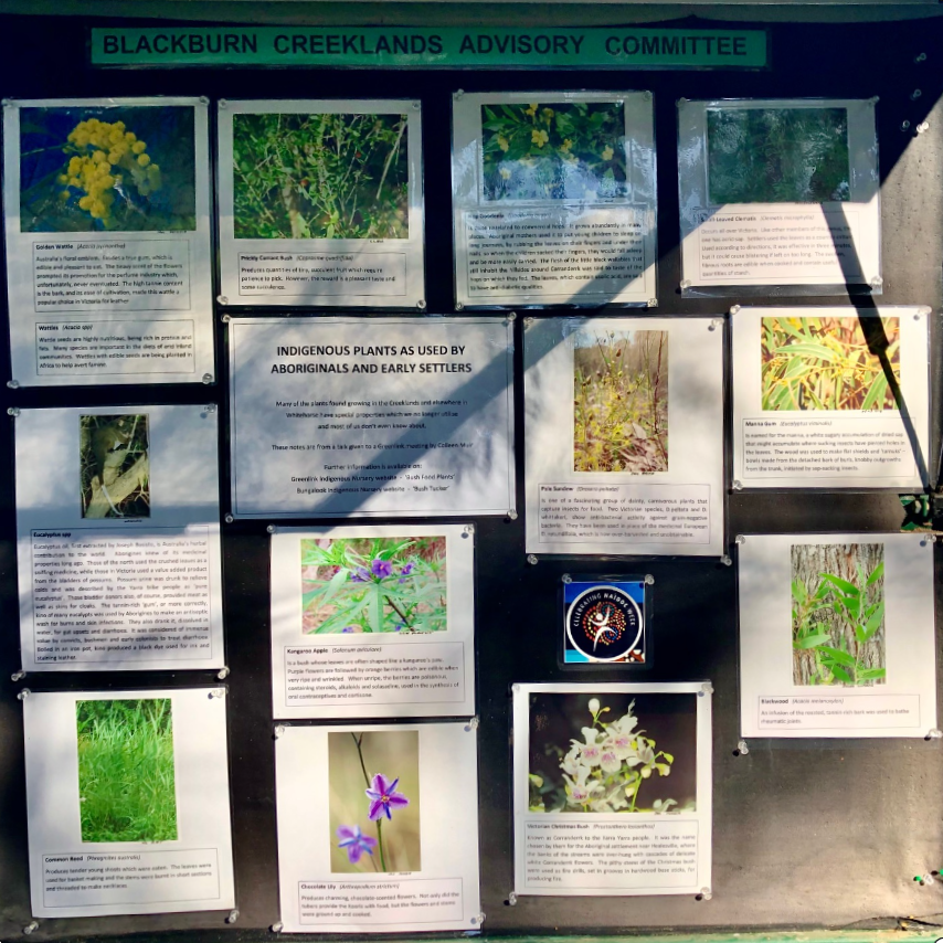 To celebrate NAIDOC week, our noticeboard (on its reverse side) features a display of indigenous plants listing special properties that our first peoples learned over the 60,000 years they’ve been here. Please click here if you would like to learn more about the Wurundjeri and the Kulin nation in relation to the Blackburn Creeklands.