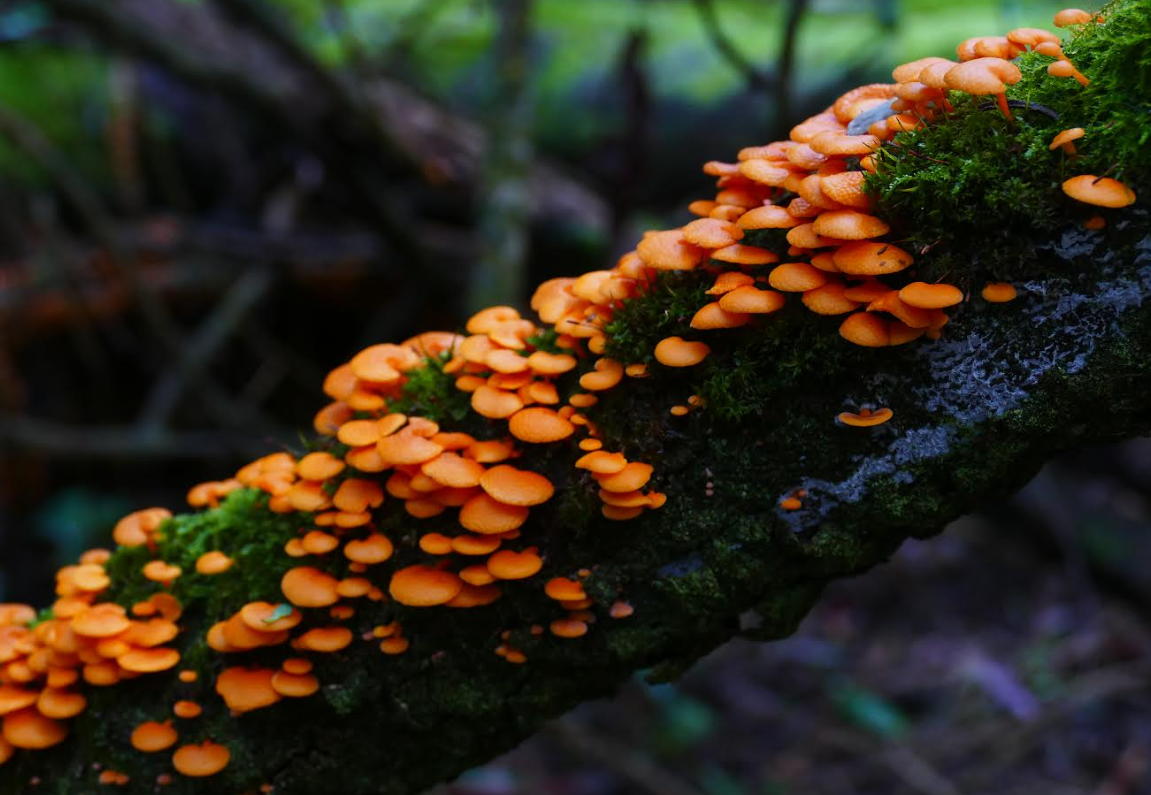 Unfortunately, the featured fungus seems to be the highly invasive Orange Pore fungus or Orange Ping-Pong Bat (Favolaschia calocera). That fungus is believed to have originated in tropical Africa but has invaded many parts of the world including non-tropical Switzerland – not the first species to come out of Africa and dominate the globe!