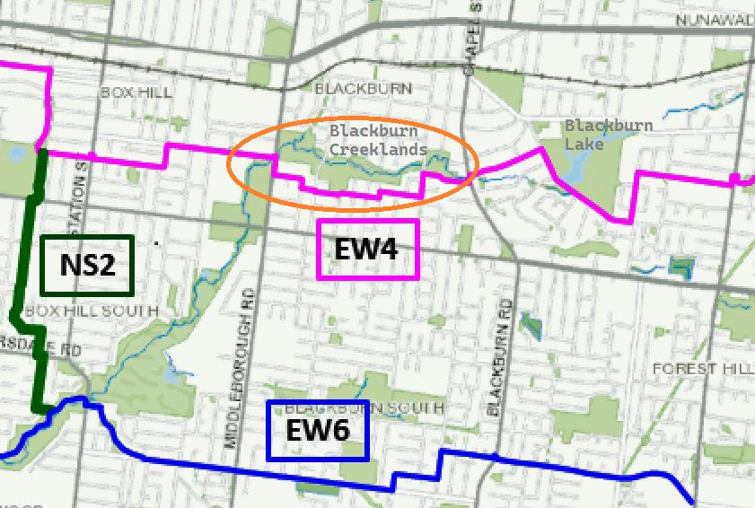As can be seen, EW4 crosses to the south of the park and also skirts Blackburn Lake Sanctuary on its way from Box Hill to points further east. So our problem sign should be pointing to Janet Street, not into the park.