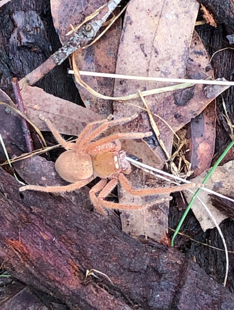 It’s been identified as a Badge Hunstman Spider (Neosparassus diana) and is common in woodlands across Australia. As Nicky’s photos clearly show, its front two pairs of legs are a lot longer than the rear pair – giving it a rather disproportionate look. The “Badge” part of its name refers to a characteristic black shield-shaped marking on its underside. Despite the fact that it rarely bites, we didn’t turn it over to get a shot!