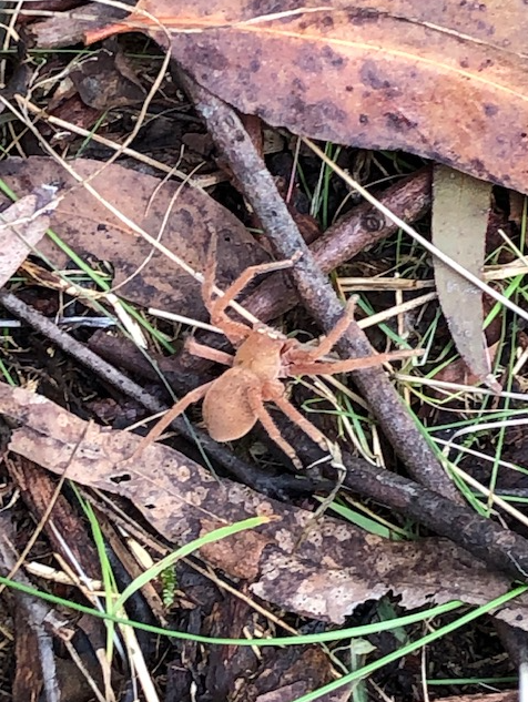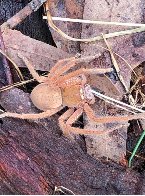 It’s been identified as a Badge Hunstman Spider (Neosparassus diana) and is common in woodlands across Australia. As Nicky’s photos clearly show, its front two pairs of legs are a lot longer than the rear pair – giving it a rather disproportionate look. The “Badge” part of its name refers to a characteristic black shield-shaped marking on its underside. Despite the fact that it rarely bites, we didn’t turn it over to get a shot!